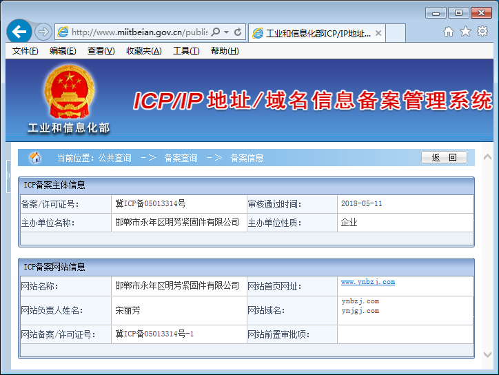 我公司更名為邯鄲市永年區(qū)明芳緊固件有限公司,同時(shí)公司網(wǎng)站在工信部的備案信息也進(jìn)行了更新并通過(guò)審核,備案號(hào)不變(冀ICP備05013314號(hào)-1)。這次更新備案信息,除了保留原有域名ynbzj.com(永年標(biāo)準(zhǔn)件之意)外,新增域名ynjgj.com(永年緊固件之意)。
